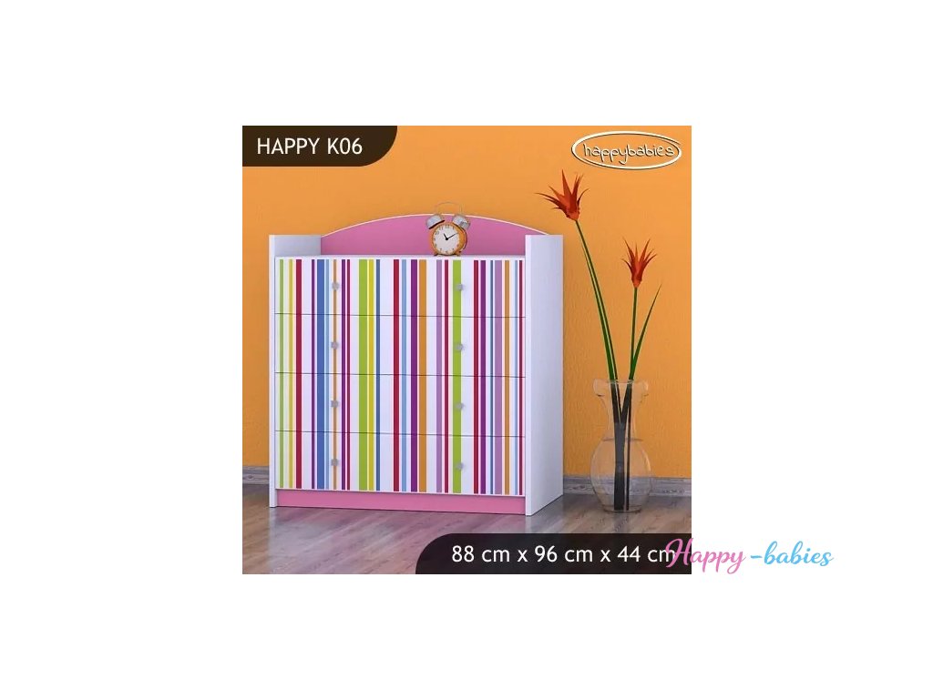 Komoda Happy K06 – barevné pásky je kvalitní a masivní dětská komoda s moderním hravým designem, ideální do dětského pokoje.